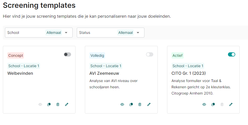 - Actief: De gebruikers vinden de klasscreening in hun overzicht terug en kunnen die invullen.